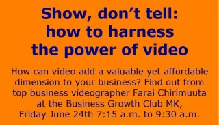 How can video add a valuable yet affordable dimension to your business?Find out from top business videographer Farai Chirimuuta at the Business Growth Club Milton Keynes, Friday June 24th 7:15 a.m. to 9:30 a.m.