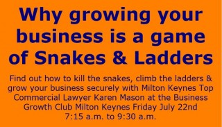 Find out how to kill the snakes, climb the ladders and grow your business securely with Milton Keynes Top Commercial lawyer Karen Mason at the Business Growth Club MK Friday July 22nd 7:15 a.m. to 9:30 a.m.