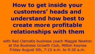 How to Get Inside Your Customers' Heads and Understand How Best to Create More Profitable Relationships With Them with Red Clematis business coach Maggie Newton at the Business Growth Club, Milton Keynes Friday August 5th, 7:15 a.m. to 9:30 a.m.